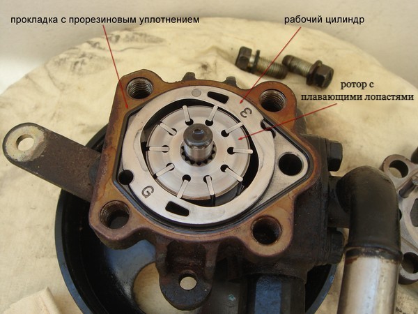 Внимательно осмотрите содержимое и запомните (можно сделать фотографию) что где и как стояло (больше внимания нужно обратить на положение цилиндра). Можно покрутить шкив ГУРа и аккуратно пинцетом проверить, как двигаются лопасти в пазах ротора.