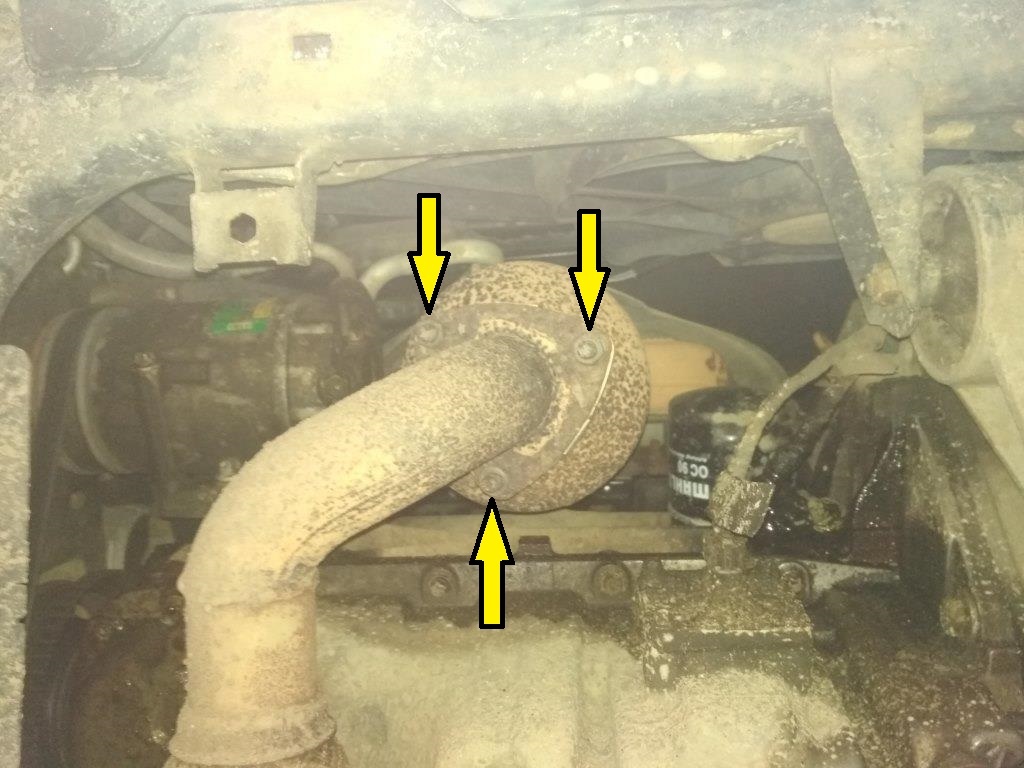 - Торцевой головкой на 13 мм откручиваем три гайки крепления трубы глушителя выхлопной системы к катализатору.