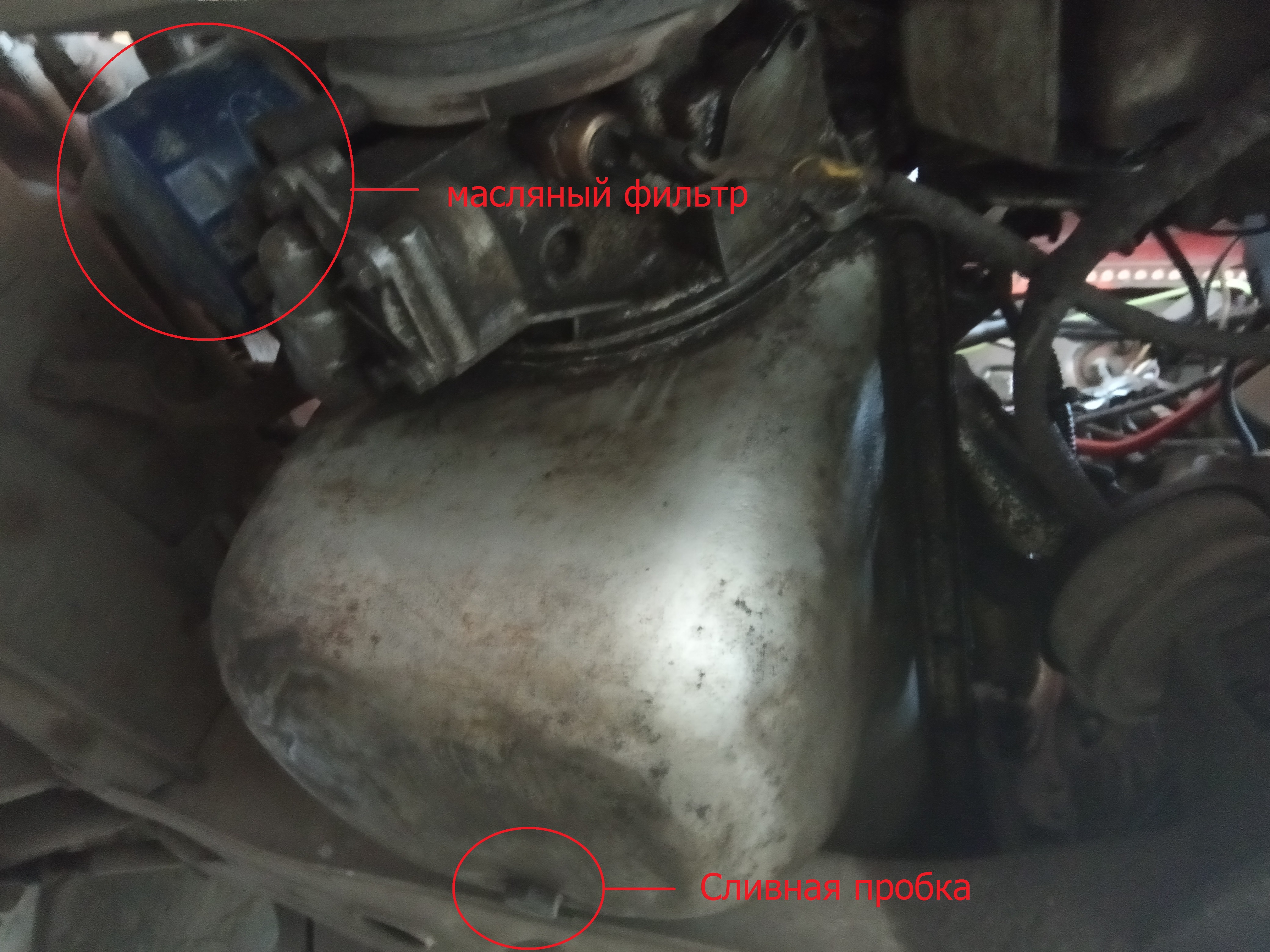 Далее поддомкрачиваем автомобиль и начинаем замену. Сливная пробка 19 мм находится на задней части масляного поддона, используйте ключ и открутите ее. Здесь же вы сможете увидеть масляный фильтр, он расположен на передней части двигателя слева, под гидроусилителем.