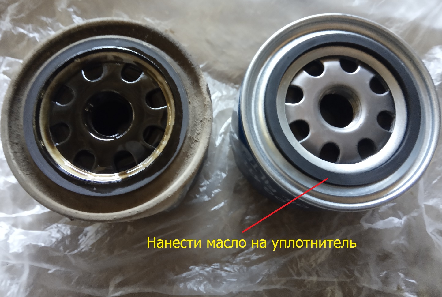 Перед установкой масляного фильтра, следует наполнить его маслом. Старайтесь не перелить масло. Очистите место установки. Нанесите небольшое количество чистого масла на резиновое уплотнительную прокладку на фильтре.