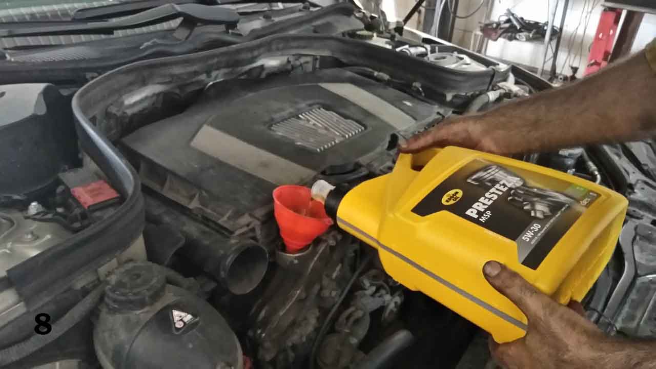 В двигателе M272 отработанного масла, примерно 5-6 л. Время полного слива старого масла 15-20 мин. После можно открутить масляный фильтр двигателя для полного слива, так как часть под давлением удерживается. После всех работ по этапу слива старого необходимо поставить на место пробку и поставили масляный фильтр. - Масло будем использовать KROON OIL 5W-30 34668.
