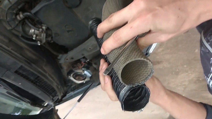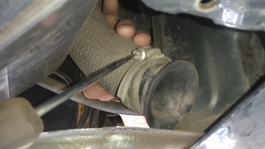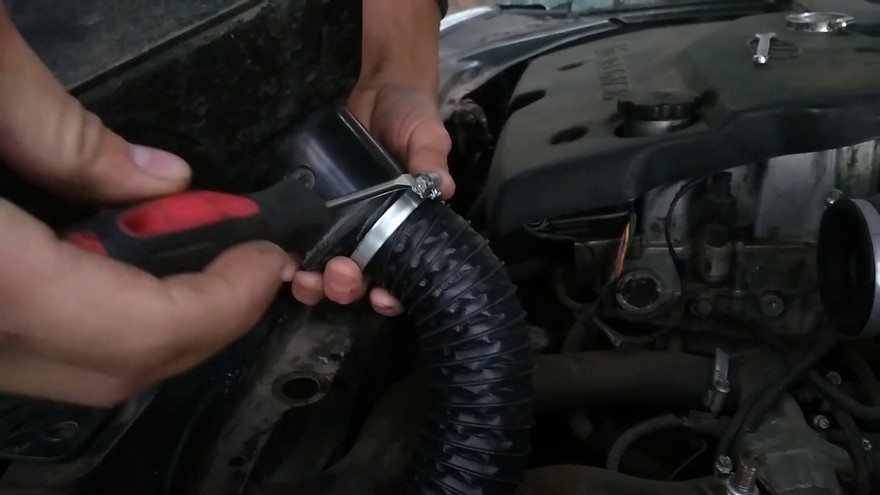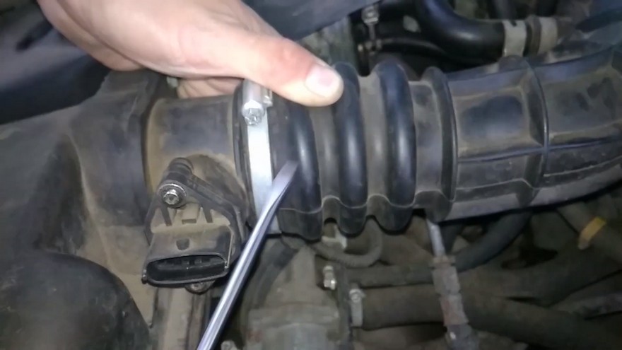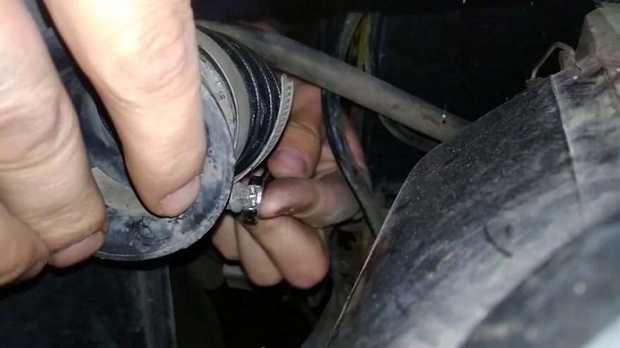 Откручиваем хомут крепления патрубка к корпусу, убираем корпус в сторону.