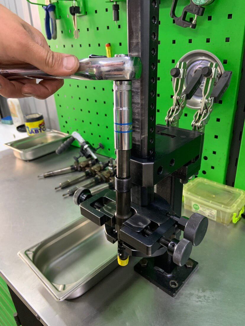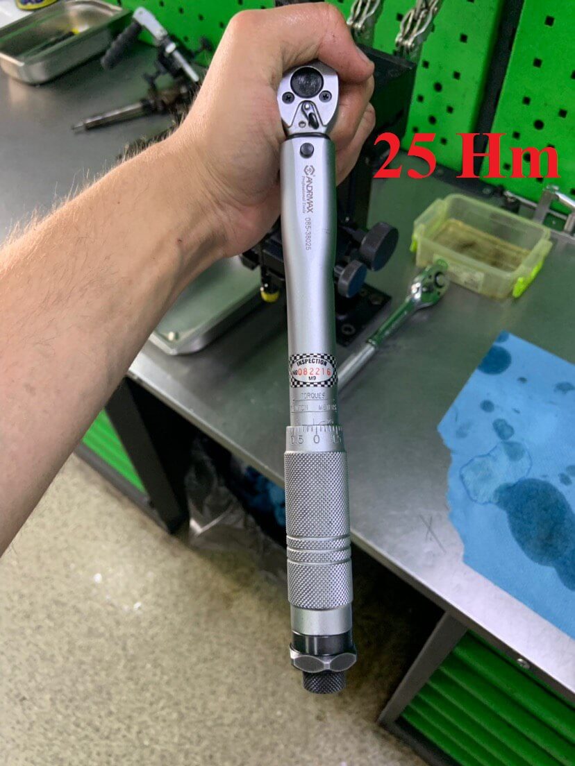 Одеваем гайку и зажимаем ее динамометрическим ключом на 25 ньютон на метр. Если все сделать правильно форсунку можно смело ставить на автомобиль.