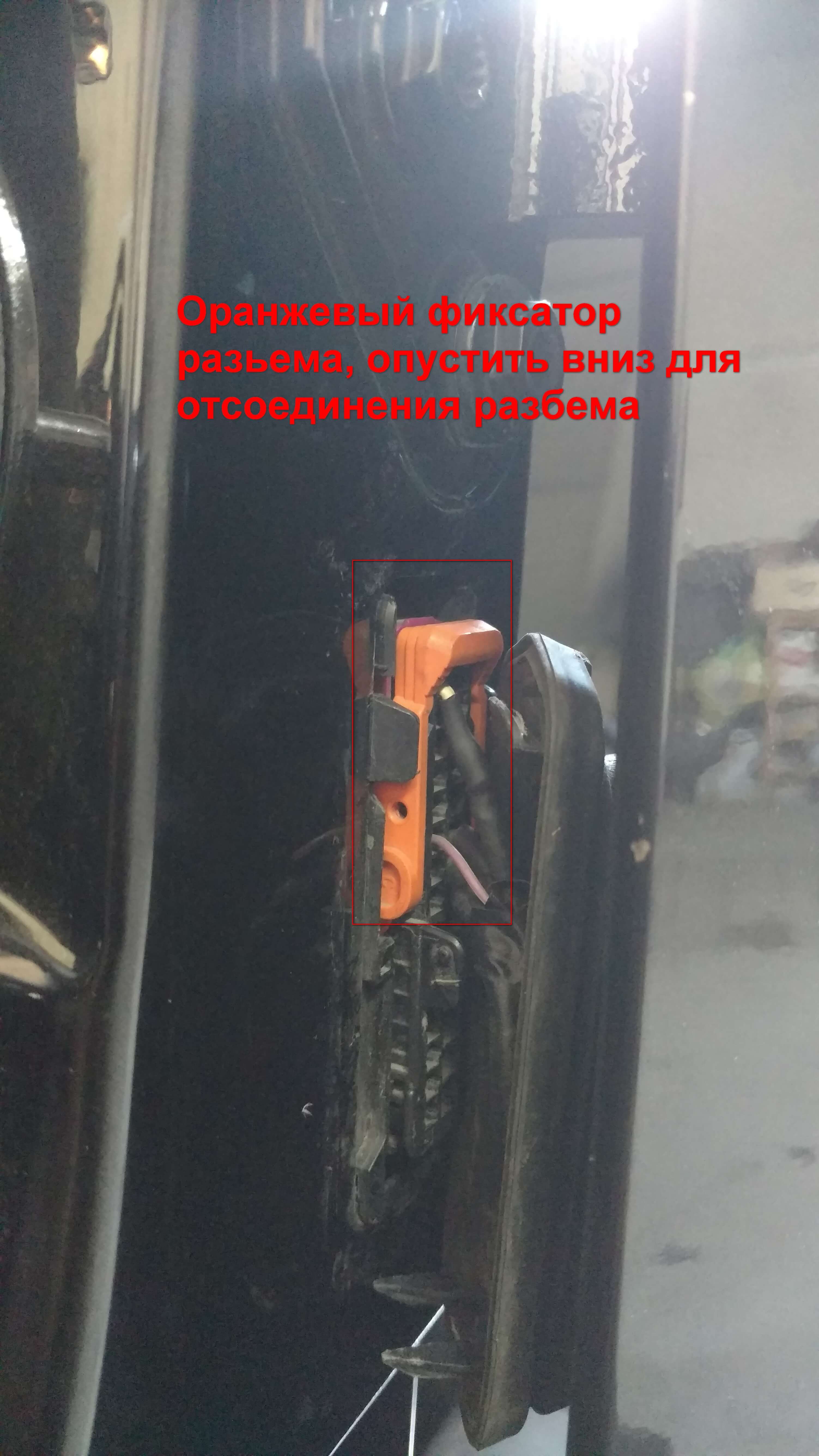 Для того чтобы поменять проводку первым делом нужно разобрать дверь (в данном автомобиле не нужно снимать карту двери, здесь снимается внешняя филенка двери), затем снять резиновую гофру с проводов, отсоединить разъем и вытащить его внутрь двери.