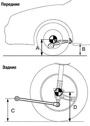 - C — расстояние от центра болта крепления продольного рычага соответствующего измеряемого заднего колеса до земли.
