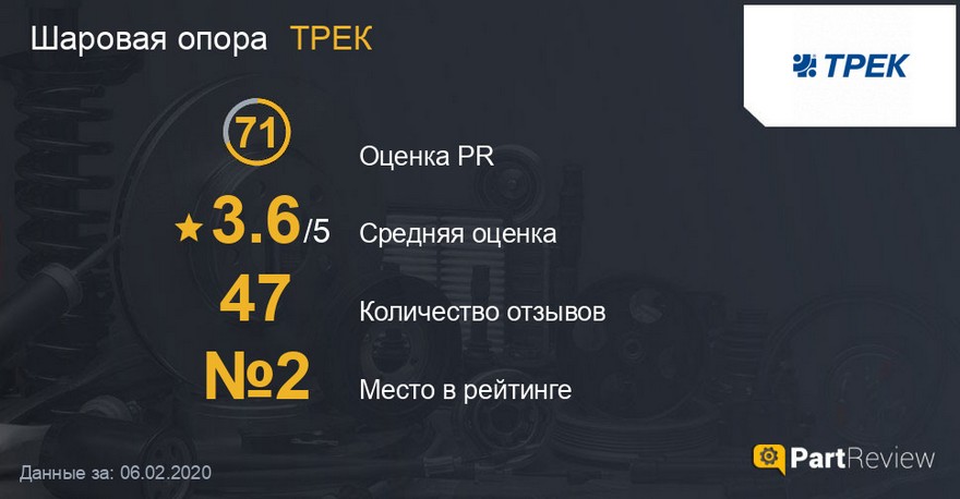 Когда лидер по популярности входит хотя бы в ТОП 3 по качеству — это тоже достаточно редкий случай для наших рейтингов. Но судя по отзывам автовладельцев, шаровые опоры “ТРЕК” реально можно считать лучшими в России. Всего на сайте PartReview есть 47 мнений об этих деталях и больше только у известного бренда CTR. Но только если у CTR почти треть из них — негативные, у “ТРЕКа” плохих отзывов всего 12 штук.