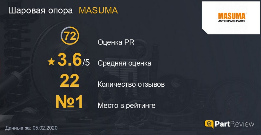 На втором месте нашей подборки — детали японского бренда Masuma. У него первое место в рейтинге качества, хотя о низкой оценке по сравнению с другими группами запчастей мы уже упоминали. По популярности это только четвертый бренд, причем у него всего 22 отзыва. И по количеству отзывов он вообще девятый в списке.
