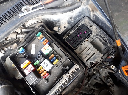 Открыв капот, находим монтажный блок. Он находится слева по ходу движения автомобиля. Открываем крышку. Нам нужно реле, которое включает зажигание (main relay, master relay). Вынимаем его, и при помощи проводка, начинаем подавать напряжение от АКБ, поочередно на все контакты, до тех пор, пока у нас не включится зажигание (на панели загорятся индикаторы). Лампочку мы включаем в цепь для того, что бы ничего не сгорело.