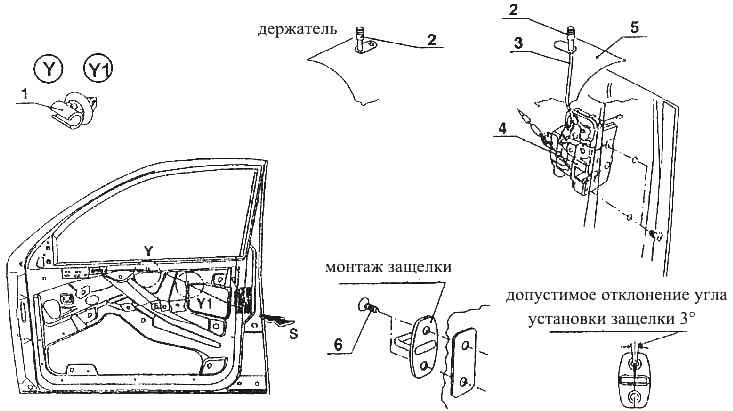 Механизм передней двери: 1 – скоба; 2 – наконечник тяги; 3 – тяга; 4 – замок двери; 5 – панель двери; 6 – винт