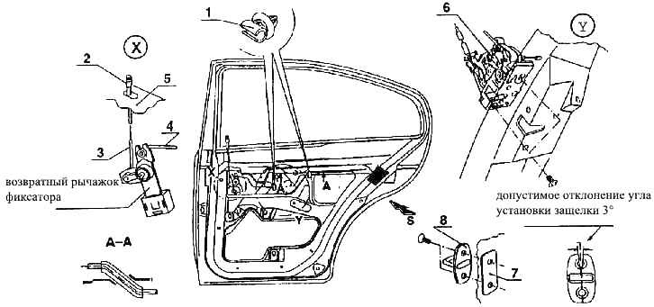 Механизм задней двери: 1 – скоба; 2 – наконечник тяги фиксатора; 3 – тяга фиксатора; 4 – тяга; 5 – возвратная кнопка фиксатора; 6 – замок двери; 7 – держатель; 8 – защелка