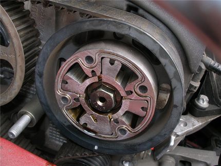 Проверку работы фазика можно выполнить и без демонтажа. Но для выполнения проверки по износу фазорегулятора его необходимо снять и разобрать. Чтобы найти где он находится нужно ориентироваться по переднему краю распредвала. В зависимости от конструкции мотора демонтаж самого фазорегулятора будет отличаться. Однако в любом случае, через его кожух перекинут ремень ГРМ. Поэтому нужно обеспечить доступ к ремню, а сам ремень нужно снять.