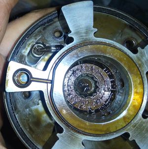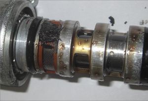 - Попадание пластиковой стружки. На фазорегуляторах часто лопатки делаются из пластмассы. По мере их износа они меняют свою геометрию и выпадают из посадочного места. Вместе с маслом они попадают в клапан, распадаются и измельчаются. Это может привести либо к неполному ходу штока клапана, либо даже к полному его заклиниванию.
