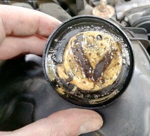 Когда эмульсия желтого либо коричневого цвета не просто на масляной крышке или краях горловины, а видна внутри двигателя, то значит стоит разбирать мотор и искать причину, так быть не должно. Ездить на такой масляной смеси можно недолго!