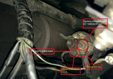 Первый, и самый часто используемый, — замкнуть контакты отверткой либо другим металлическим предметом. При включенном зажигании достаточно просто замкнуть контакты на корпусе стартера. Контакты находятся на внешней стороне корпуса стартера, к ним подходят провода. Замыкать нужно клемму от аккумулятора (силовой провод, +12 Вольт) и клемму старта мотора стартера. К клемме зажигания притрагиваться нельзя, как нельзя коротить +12 В на корпус стартера!