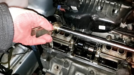 - Установите приспособление для замены шайб на шпильки крепления крышки, чтобы при нажатии на рычаг его клык заходил между шайбой клапана и эксцентриком распредвала.