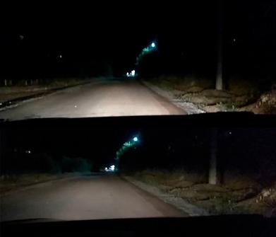 Наглядный пример отрегулированных фар (вверху — правильно отрегулированные противотуманные фары, внизу — включенный только ближний свет)