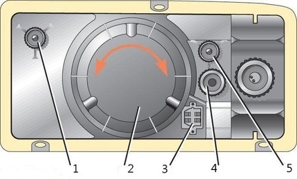 Схема фар ВАЗ 2107: 1 – винт горизонтальной регулировки, 2 – крышка лампы, 3 – разъем питания, 4 – установочный винт-заглушка или гидрокорректор, 5 – винт вертикальной регулировки