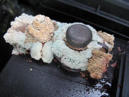 «Шуба» из окислов на клемме, которая говорит об утечке и воздействии кислотного электролита