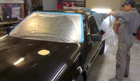 Держа краскопульт перпендикулярно поверхности автомобиля, нанесите два-три слоя резиновой краски. Начинайте красить правую заднюю стойку, затем крышу, затем левую заднюю стойку, багажник, дальше придет очередь бампера и задней части. Далее от заднего крыла с левой стороны до передней дверцы, от нее – к фарам, к левой стороне капота (прокрашиваем фары), радиаторной решетке. После чего наступит очередь правой передней дверцы и заднего правого крыла.