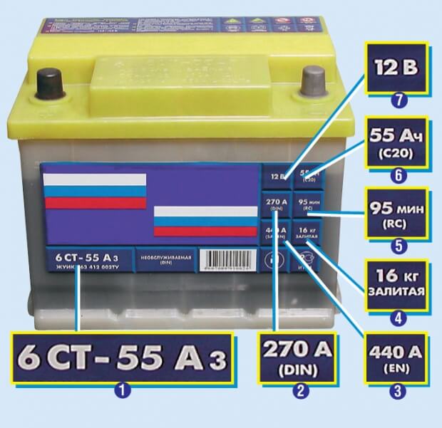 1 – условное обозначение; 2 и 3 – ток холодной прокрутки по DIN и EN;4 – вес; 5 – резервная емкость; 6 – номинальная емкость; 7 – номинальное напряжение.