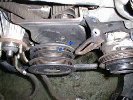 Не стоит забывать отключать аккумулятор, а так же надо снять вентилятор радиатора и все V-образные ремни, чехол ремня тоже нужно снять. Снимать ремень нужно снимать в том месте, где стоят треугольники, усилие должно направляться по стрелочкам.