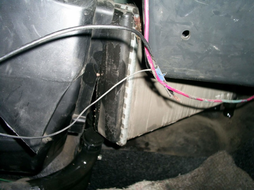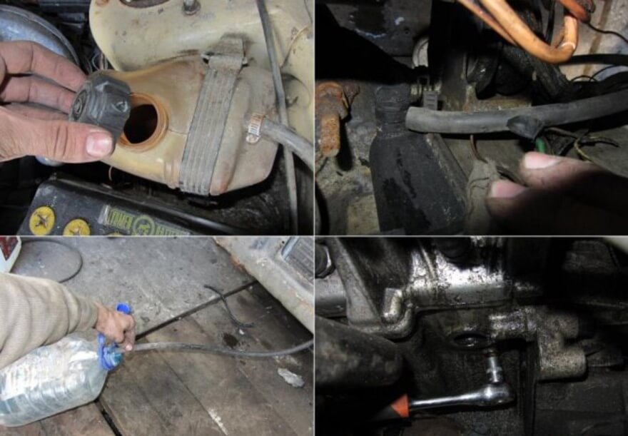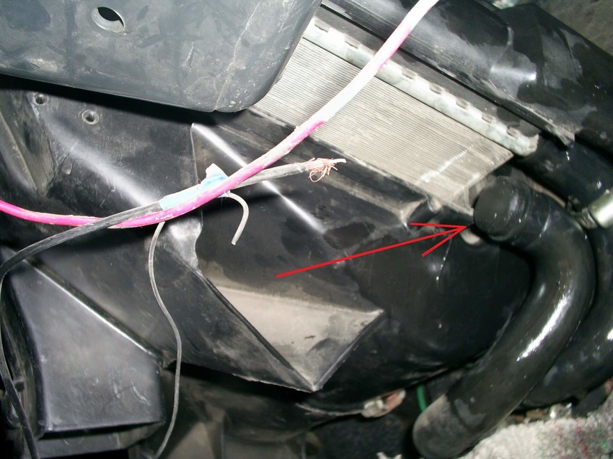 Чтобы струя не разбрызгивала тосол, можно подложить небольшую пластмасску. Жидкость будет аккуратно стекать с защиты картера в тару.Радиатор печки расположен в ногах у переднего пассажира.