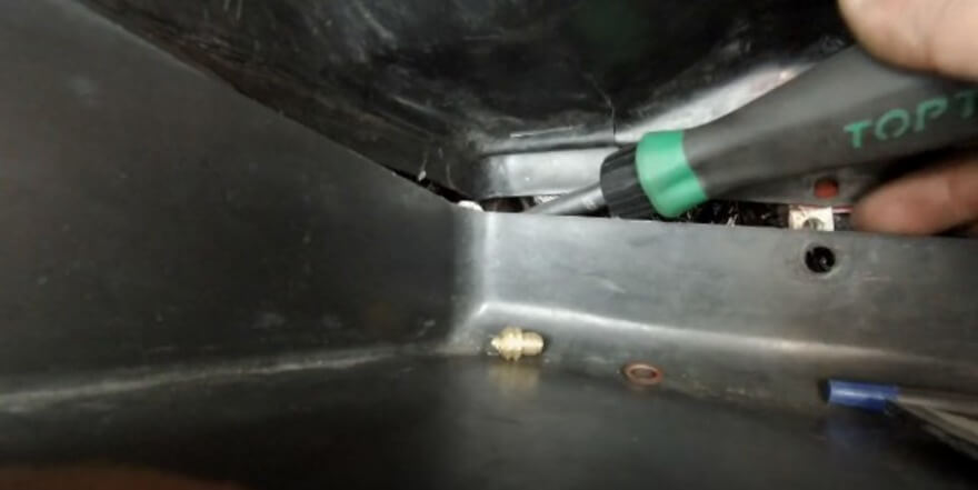 Открутить два шурупа на радиаторе возле патрубков. Третий саморез находится в неудобном месте, поэтому демонтируем его через бардачок. Предварительно снимаем верхнюю крышку с защелок.