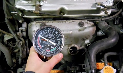 Двигатель перекручивать не нужно! 5-7 секунд вполне достаточно. Не нужно использовать манометр меряющий до 3 кг/см3, так как он может даже не почувствовать давление. Максимум манометра 2кг/см3, лучше 0,5 (иначе погрешность может быть соизмерима с величиной измерения). Я пользовался не совсем подходящим манометром, но при этом максимум был 0,5кг/см3, максимум во время моментального увеличения оборотов с ХХ до 5000 (манометр дёрнулся и упал на «0» ). Так вот — это не считается.