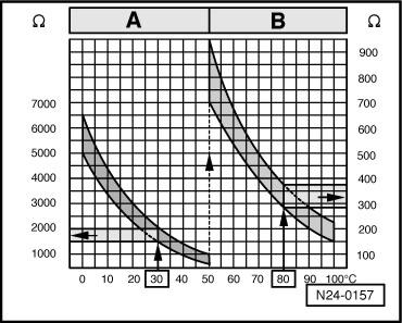Область -A- показывает значения сопротивления для диапазона температур 0… 50 °C, область B — значения для диапазона температур 50… 100 °C.