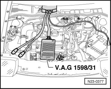 - Проверить провода между 121-контактным кабелем переходника -V.A.G 1598/31- и 4-контактным штекером в соответствии с электрической схемой на обрыв;