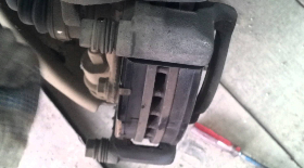 Далее понадобится открутить два болта тормозного суппорта с помощью ключа/головки на 14. После этого надо снять и аккуратно положить или подвесить суппорт так, чтобы он не оттягивал тормозной шланг. Затем снимаются тормозные колодки, при этом стоит запомнить, где был расположен акустический датчик износа — пластинка, которая начинает елозить по металлу, когда накладка стирается до опасного уровня.