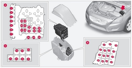 Блок предохранителей под капотом (1 на картинке выше) находящийся возле АКБ, состоит из 3 частей, которые условно обозначаются как A, B, C. Чтобы добраться к блоку C необходимо открутить крепление с верхним блоком A, и потянуть его на себя.