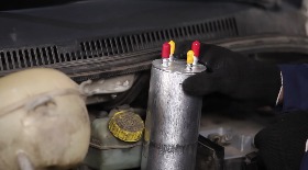 Для начала нам нужно демонтировать верхнюю часть корпуса воздушного фильтра. Для этого снимаем разъем питания датчика расхода воздуха. Отжимаем фиксатор в сторону провода и снимаем.