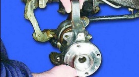 После того, как с автомобиля снят поворотный кулак, выпрессовываем ступицу из внутренней обоймы подшипника, воспользовавшись выколоткой.