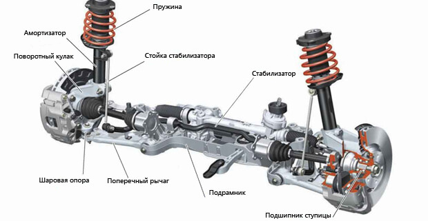 Подвеска — формирует связь несущей системы (кузов, рама) с колесами либо мостами. Она предназначается для поглощения и смягчения ударов, возникающих в процессе движения колес по неровностям дороги. Ее задача – минимизация колебательного движения кузова с целью достижения оптимальной плавности движения.