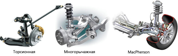 Виды подвесок: торсионная, многорычажная, Мак-Ферсон.