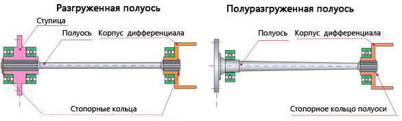 Зависимо от конструкции полуось может быть полностью или частично разгруженной от действующих на нее изгибающих моментов.