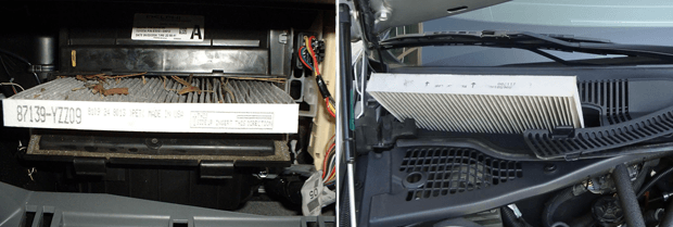 Где салонный фильтр устанавливается чаще всего в современных автомобилях? Как правило, место его размещения – перед крыльчаткой печного мотора. То есть воздух очищается еще до попадания в печку. После прохождения через фильтр и печной (кондиционерный) радиатор воздушный поток проходит через систему заслонок, разделяющую один поток на несколько, подаваемых в разных частях салона, за счет чего и обеспечивается качественная вентиляция всего пространства. Таким образом фильтр поступаемого воздуха в салон в половине случаев находится за перчаточным ящиком (он же бардачок), место установки может быть смещено под него и в сторону водителя. А в другой половине автомобилей (например Ланос, Калина, Приора и многих европейских машин) под капотом, в районе жабо (с лева или по центру).