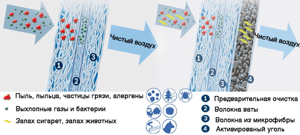 Проходя через эти пластины, воздух оставляет на них пыль и прочие примеси, а при наличии угольного слоя, и химические взвеси.