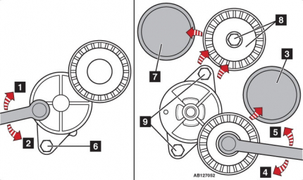 Снятие и замена приводного ремня навесных агрегатов (генератора, кондиционера, помпы, ГУРа)