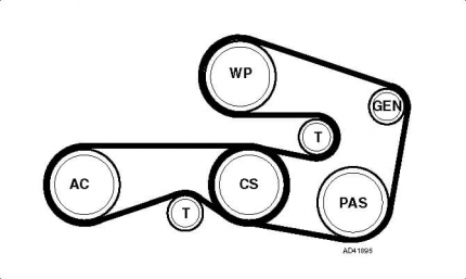 Схема установки ремня привода навесных агрегатов: AC – компрессор кондиционера; CS – шкив коленчатого вала; GEN – генератор; PAS – насос ГУР; T – натяжитель; WP – помпа.