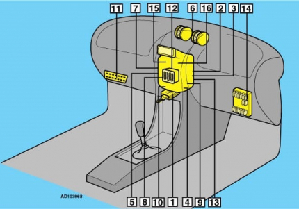 Расположение компонентов приборной панели: 1 – Электронный блок управления кондиционером; 2 – Датчик температуры за испарителем; 3 – Электродвигатель привода заслонки направления потоков воздуха (кондиционер/отопитель); 4 – Электродвигатель привода заслонки забора входящего воздуха кондиционера/отопителя; 5 – Блок управления электродвигателем вентилятора кондиционера/отопителя; 6 – Электродвигатель вентилятора кондиционера/отопителя; 7 – Электродвигатель привода заслонки обдува стекол; 8 – Электродвигатель привода заслонки подачи воздуха к ногам; 9 — Электродвигатель привода заслонки подачи воздуха к ногам, задняя часть салона(кондиционер/отопитель); 10 – Электродвигатель привода заслонки забора воздуха (кондиционер/отопитель); 11 – Диагностический разъем – 16-контактный; 12 – Испаритель; 13 – Расширительный клапан; 14 – Блок предохранителей/реле – за вещевым ящиком; 15 – Датчик температуры радиатора отопителя 1; 16 – Датчик температуры 2 радиатора отопителя.