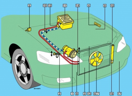 Система кондиционирования BMW: 1 – Электромагнитная муфта компрессора кондиционера; 2 – Датчик давления хладагента системы кондиционирования; 3 – Конденсатор; 4 – Диагностический разъем – 20-контактный; 5 – Электронный блок управления двигателем; 6 – Электродвигатель вентилятора системы охлаждения; 7 – Блок управления электродвигателем вентилятора системы охлаждения – встроенного типа; 8 — Датчик температуры электродвигателя вентилятора системы охлаждения – бензин; 9 – Клапан регулятора охлаждающей жидкости в отопителе; 10 – Электродвигатель насоса системы охлаждения; 11 – Испаритель; 12 – Расширительный клапан; 13 – Датчик чистоты воздуха, поступающего в отопитель; 14 – Сервисный разъем высокого давления; 15 – Сервисный разъем низкого давления; 16 – Ресивер/осушитель; 17 – Датчик температуры окружающего воздуха – в бампере.