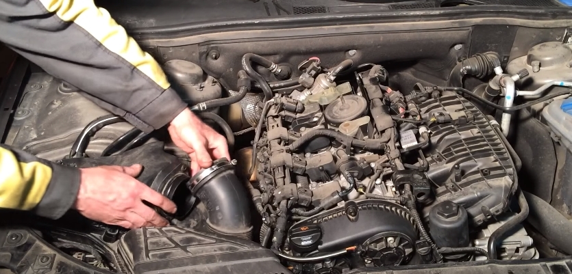 - Шлицевой отверткой отпускаем хомут подводящего патрубка и скидываем его руками. Будьте осторожны и смотрите, чтобы мусор не попал в патрубок. Воздух из этого патрубка идет прямо на турбину.