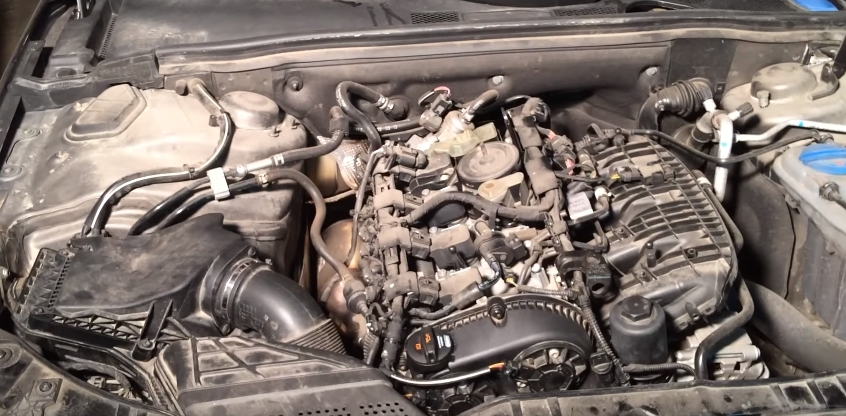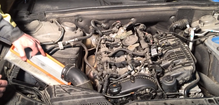 Произвести замену воздушного фильтра двигателя на Ауди А4 B8 1.8 TFSI своими руками очень просто. Фильтр расположен в подкапотном пространстве слева.