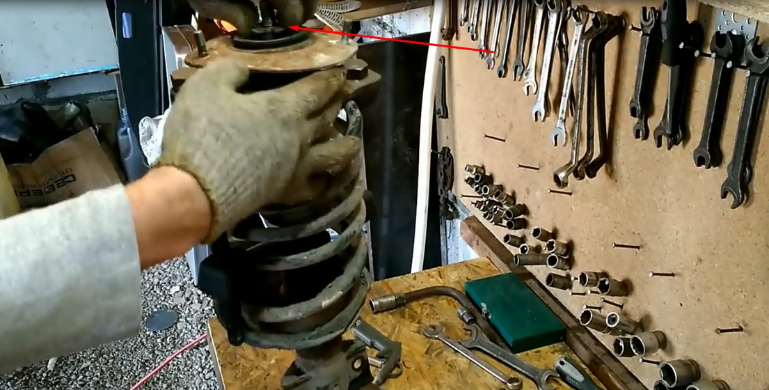 - Откручиваем гайку крепления опорного подшипника. Откручиваем гайку накидным ключом на семнадцать и одновременно удерживаем шток стойки от поворота с помощью Torx T25.