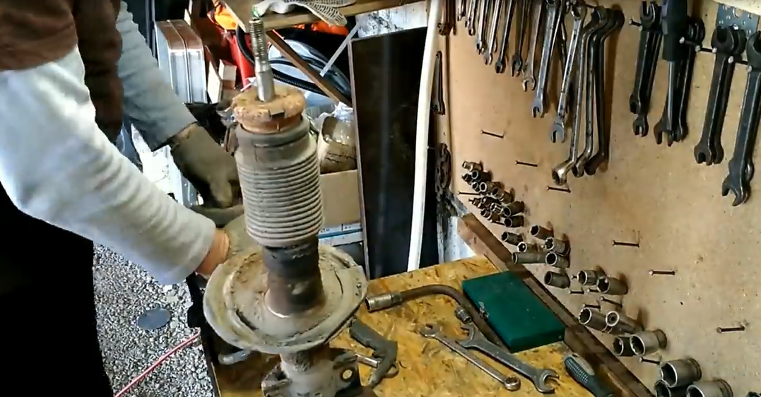 - Вынимаем стойку и зажимаем ее в тисках. После снятия стойки поворотный кулак лучше зафиксировать проволокой чтобы не выпал привод из ступицы.