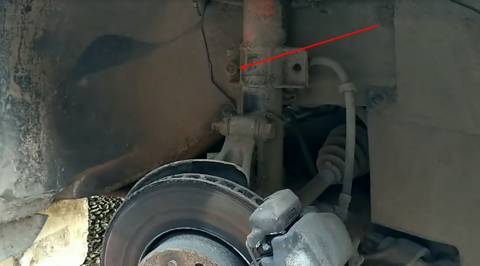 - Откручиваем и вынимаем два болта крепежа стойки к кулаку. Удерживаем головку болта накидным ключом, а воротком с головкой откручиваем гайку. Гайка и головка болта на семнадцать.