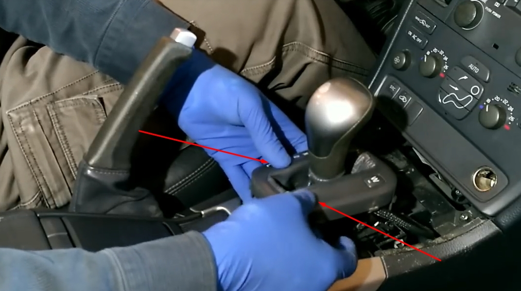 - Беремся за ручку АКПП двумя руками и с силой дергаем ее вверх. Она на защелке. Смотрите чтобы при сдергивании ручки не повредить зеркало заднего вида.