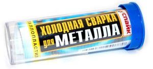 - Холодная сварка. Недорогое химическое средство, предназначенное для «склеивания» металлических поверхностей между собой и заделывания трещин. Холодные сварки производятся под разными торговыми марками, соответственно, они обладают разными характеристиками. Поэтому при выборе нужно выбирать термостойкую сварку. Обычно для полного застывания этого средства должно пройти примерно 10…12 часов при естественной температуре. Эффективность зависит, во-первых, от производителя, во-вторых, от подготовленности поверхности и характера повреждения.